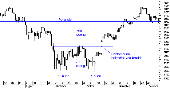 Dobbel bunn i Dow Jones. Kjøp når indeksen bryter motstanden. Potensialet er opp til 8900 poeng. Kilde: Metastock Professional.