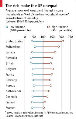 Seen from an international perspective, America certainly looks an unequal country, but in a way that many of those optimistic Americans might be proud of (see chart). According to the EPI, admittedly using figures from the late 1990s, the gap between the top and bottom tenth of earners in America is wider than that in almost any other rich country. Even so, America's poorest are (in real purchasing-power terms) only a tiny bit worse-off than their peers in Sweden, Finland and Denmark; and they are better-off than those in Britain and Australia.